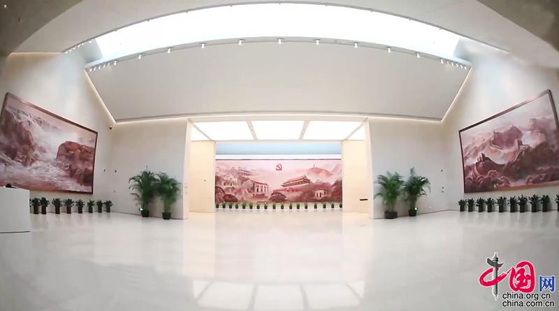 前厅壁画创作把握党史精神,创新艺术与工艺语言,以新材质、新工艺精准展现党史的象征和精神追求,作品形象质实,境界旷远,风格雄浑而语言细腻。作品力求通过具象的语言、宏阔的场景、特定的氛围表现和烘托党的奋斗历程和伟大成就,从而鼓舞斗志、明确方向;诠释党的光荣传统和优良作风,从而坚定信念、凝聚力量;再现用党的实践创造和历史经验,从而启迪智慧、砥砺品格。壁画创作注重创新探索,精益求精,综合考虑展馆建设需求、作品呈现效果和展示持久性等因素,采用高温烧制的瓷板画工艺,以红色为主基调,采用一流陶瓷胚板雕刻釉色,以1100度高温反复烧制,最终形成色调协调统一、材质坚固、画面壮丽且富有浮雕层次的特色瓷板画。这一系列壁画组画体现了新时代艺术发展、工艺振兴、新材料新技术融入艺术发展的新成果,恢弘大气,展现新时代文化气象。