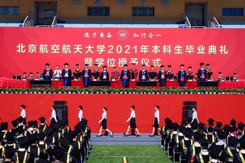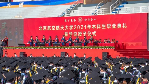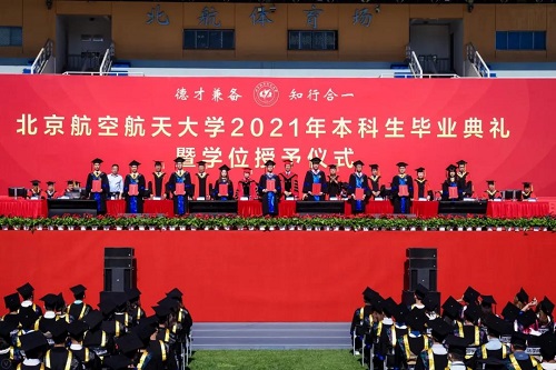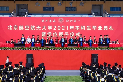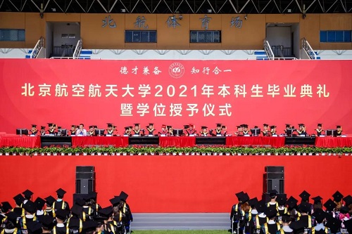 6月19日,北京航空航天大学2021年本科生毕业典礼暨学位授予仪式在学院路校区体育场隆重举行。北航党委书记曹淑敏,校长徐惠彬院士,副校长刘树春、黄海军、张广,校党委副书记赵罡,校友代表、航天科技集团一院长征五号火箭总设计师李东,教师代表、材料科学与工程学院宫声凯院士、电子信息工程学院苏东林院士、集成电路科学与工程学院赵巍胜教授,北航各学院、书院领导,学校机关部处负责人,毕业班辅导员等出席。北航副校长黄海军主持毕业典礼暨学位授予仪式。3800余名2021届本科毕业生、近900名2020届京内毕业生共聚本次毕业盛典。
