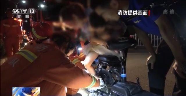 男孩已被卡住近二十多分钟,路过的热心群众尝试多种办法,始终无法将男孩救出。到场后,消防员立即用多种方式对单车进行切割破拆。