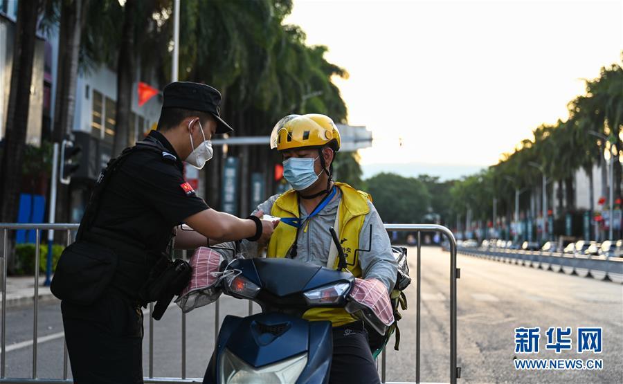 7月8日,执勤人员在检查外卖工作者通行证。新华社记者 王冠森 摄