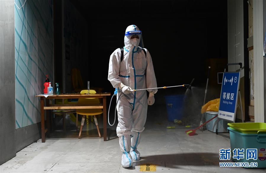 7月8日晚,瑞丽市一家隔离酒店的防疫人员在对通道进行消杀。 新华社记者 王冠森 摄