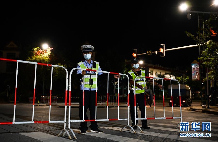7月8日晚,执勤人员在整理路障。 新华社记者 王冠森 摄