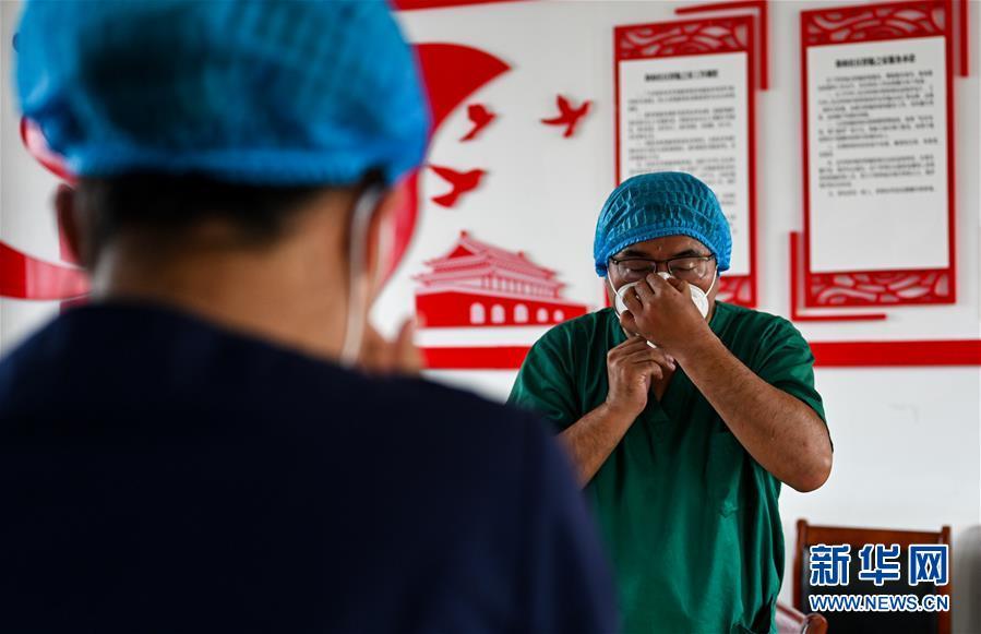 7月9日,瑞丽市卯相社区医务人员在佩戴口罩。 新华社记者 王冠森 摄
