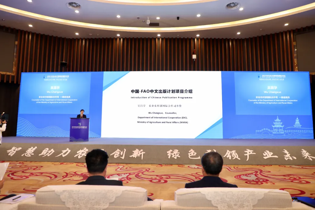 中国农业农村部国际合作司参赞吴昌学介绍联合国粮农组织中文出版计划项目。该项目由粮农组织与中国农业农村部共同实施,旨在翻译出版粮农组织的国际粮农知识信息产品,促进农业知识及信息在中国的分享传播。自1987年启动至今,该计划已实施30余年,翻译出版了600多种粮农组织出版物。©FAO/Peiling Gan
