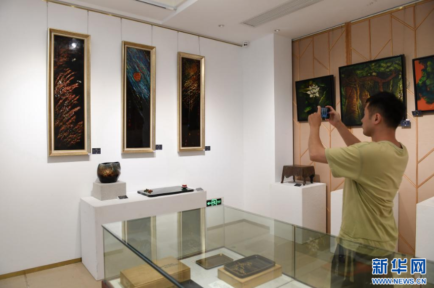 7月21日,漆艺爱好者在拍摄漆画作品。新华社记者 林善传 摄