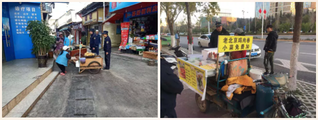 强化日常巡查,重点地段安排专人值守,采取集中整治与常态化管理相结合,每天对春融街地铁站A口、集市街、县医院、呈贡广场、公交车站台及各道路沿线的商铺等重点区域进行巡查监管,清理占道经营、漫摊经营,坚决取缔公交站台、地铁出站口、道路沿线的占道经营和临时流动摊点,防止占道经营、店外经营、串店经营行为的恶性发展。