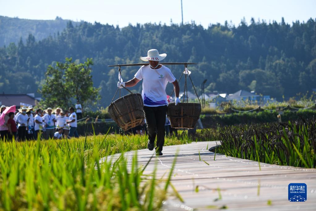 9月22日,农民在稻田间的游览栈道上参加“挑稻谷接力”趣味比赛。