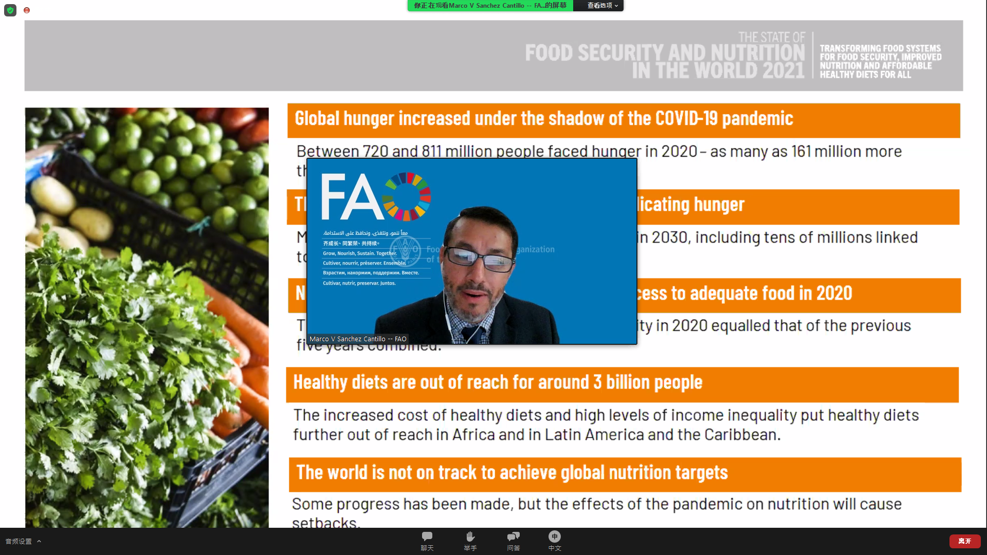 联合国粮农组织农业食品经济司副司长Marco Sanchez Cantillo在粮农组织总部罗马远程参加会议,并对报告中的关键数据和全球粮食安全及营养状况进行了全面分析。©粮农组织