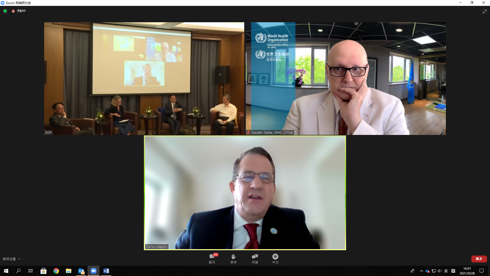 小组讨论环节线上嘉宾,下方:联合国粮农组织驻华代表文康农,右上:世界卫生组织驻华代表高力。©粮农组织