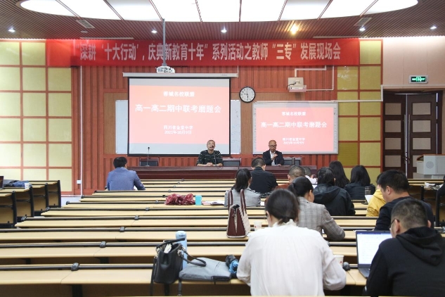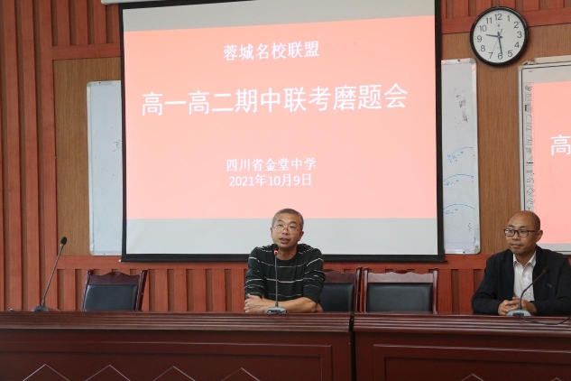2021年10月9日上午,蓉城联盟高一高二期中联考磨题会在四川省金堂中学校学术一厅召开。蓉城名校联盟(棠湖中学、崇庆中学、简阳中学、大弯中学、新都一中、邛崃一中、温江中学、龙泉中学、新津中学、金堂中学、郫都一中、彭州中学、大邑中学、蒲江中学)各学科组组长、老师参加了会议。四川省金堂中学校副校长夏位儒,教务处副主任黄勇出席会议,会议由蓉城名校联盟负责人黄斌主持。