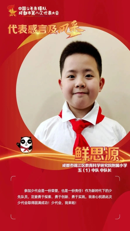 2021年10月12日至14日,中国少年先锋队成都市第八次代表大会召开。学校少先队员代表鲜思源同学有幸选入锦江区代表团参与会议。