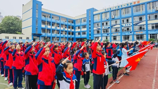 学校少先队员和一年级的小弟弟小妹妹们精神饱满、朝气蓬勃地齐聚操场,进行庄严的升旗仪式。