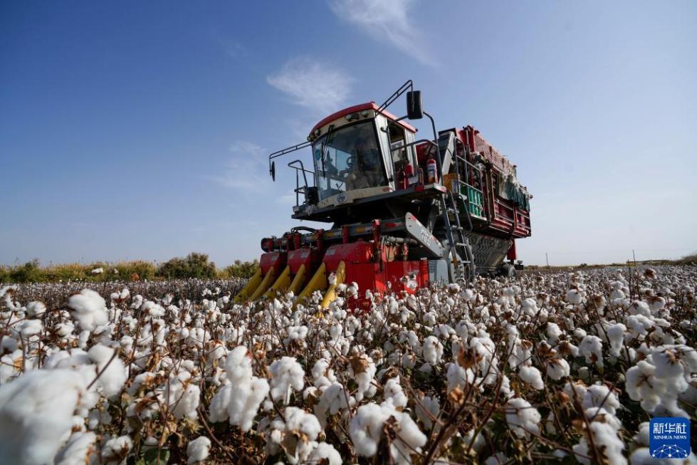 10月15日,在尉犁县古勒巴格乡一处棉田,采棉机在采收新棉。新华社记者 赵戈 摄