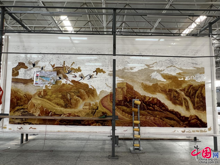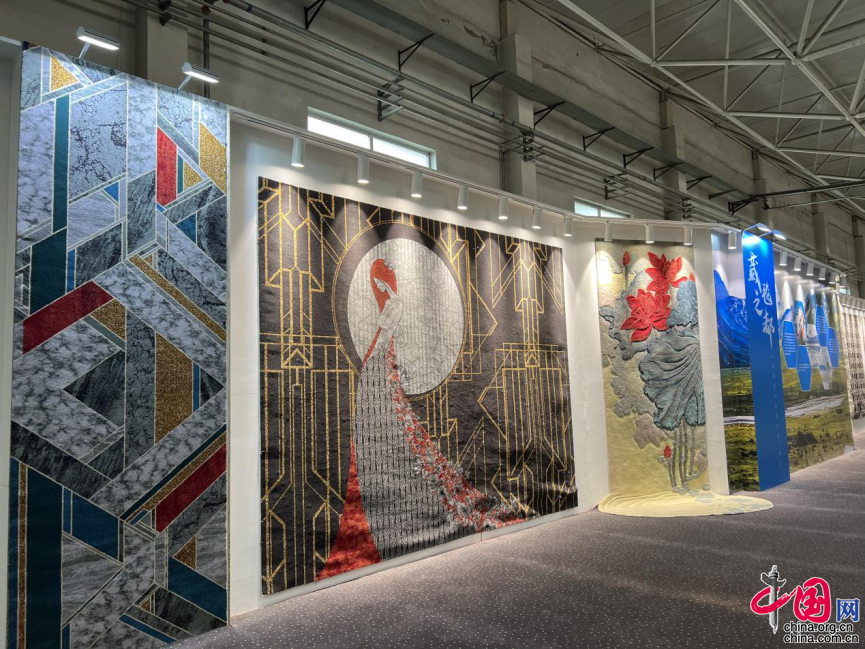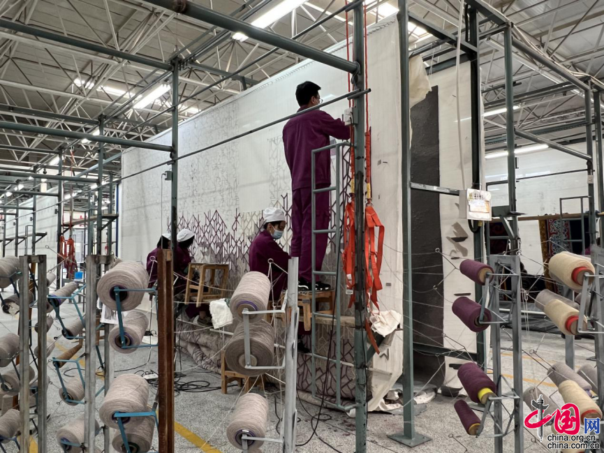 走进生产车间内,机器轰鸣声中,针线在机器上迅速穿梭,编织出精美的图案。一旁的展示区里,对称精美的几何图形组合、雄浑壮美的万里长城、栩栩如生的疾驰骏马……在灯光的映射下,一幅幅藏毯显得格外绚丽。