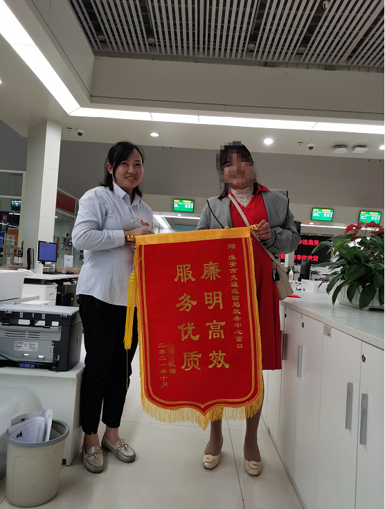 10月15日,淮汽驾校一业务办理人员来到江苏淮安市政务服务中心交通窗口,为窗口工作人员吴岚送来了印有“廉明高效服务优质”字样的锦旗。