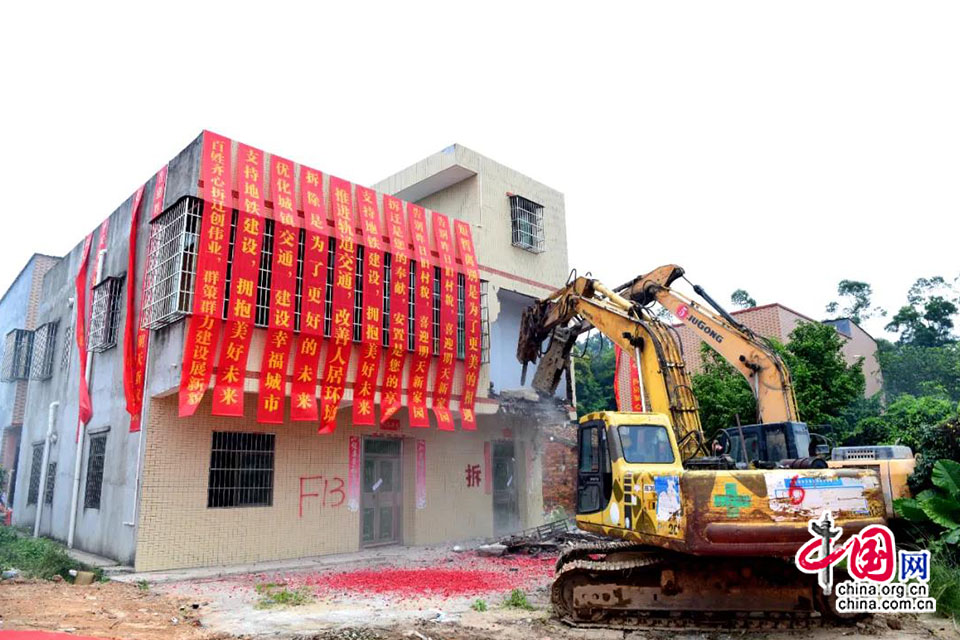 10月27日,随着鞭炮声与破拆机器的轰鸣,东莞市轨道交通1号线黄江段住宅类房屋正式拆除,打响住宅类拆迁第一枪,标志着黄江镇推进市轨道交通1号线建设工作取得阶段性成果。