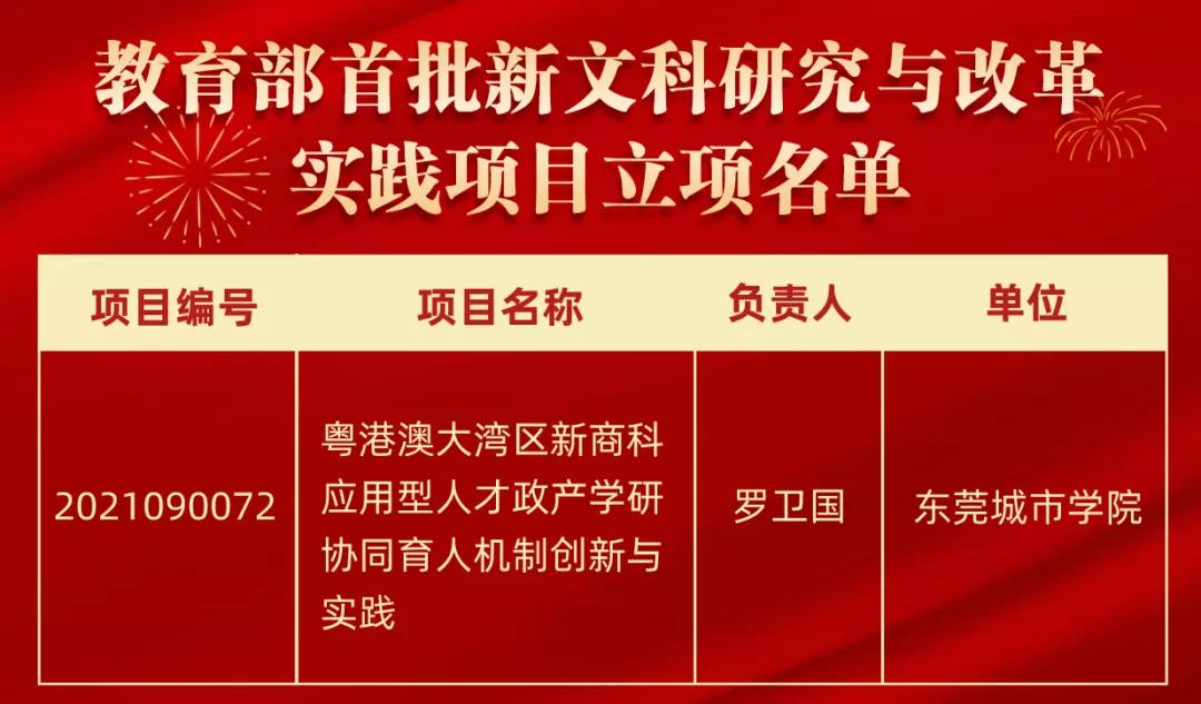 近日,教育部办公厅发布《关于公布首批新文科研究与改革实践项目的通知》(以下简称《通知》),决定认定1011个新文科研究与改革实践项目。其中,广东共有来自13所高校的39个项目入选,东莞城市学院商学院院长罗卫国主持的《粤港澳大湾区新商科应用型人才政产学研协同育人机制创新与实践》成功入选,是广东省入选的唯一民办高校,此次入选既是学校在国家级教改项目上的新突破,也是学校新文科建设的重要标志性成果。