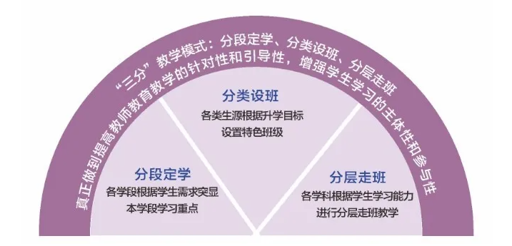 学校以“最适合的教育是最好的教育”为办学理念,因材施教,开展满足学生学科差异发展的“三分”教学模式。不同学段、不同学科、不同学习层次,均能享受到适合于你的教学模式。
