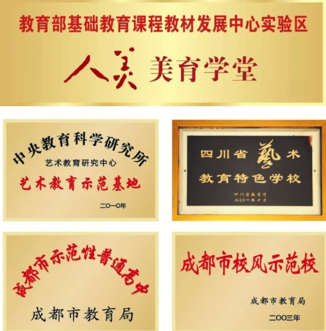 它是成都市示范性普通高中、成都市校风示范学校、四川省阳光体育示范校,四川省首批授牌的“四川省艺术教育特色学校”,是中央教科所艺术教育示范基地、教育部“社会公认特色育人成功学校”、教育部基础教育课程教材发展中心“人美美育学堂” (全国仅5所)。