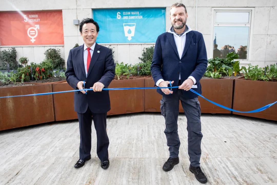 粮农组织总干事屈冬玉和NaturaSì首席执行官Fausto Jori共同为屋顶农场展示园地揭幕。©粮农组织