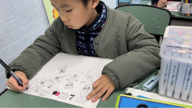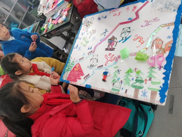 三年级以小组为单位,大家奇思妙想,共同构思传递冬奥精神的主题作品。