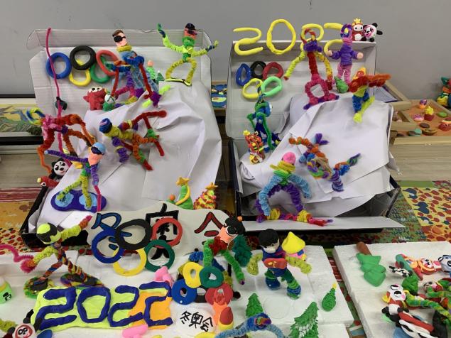 二年级以班级为单位,各班通力合作完成一个个庆冬奥的精美立体作品。