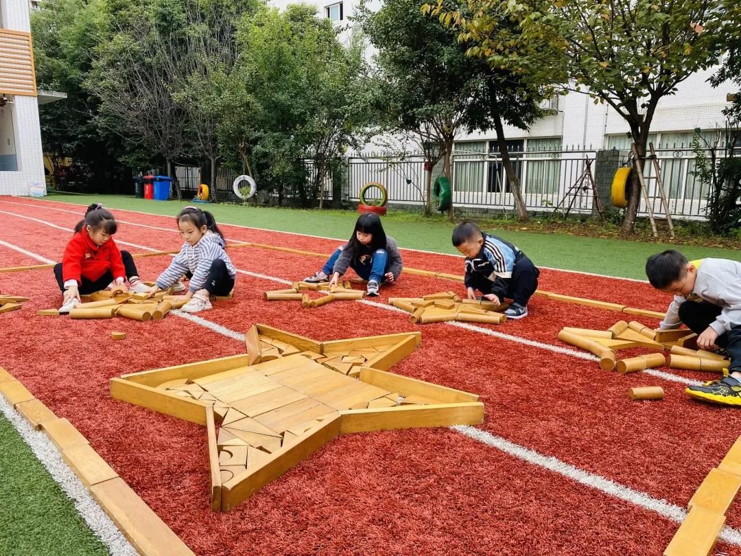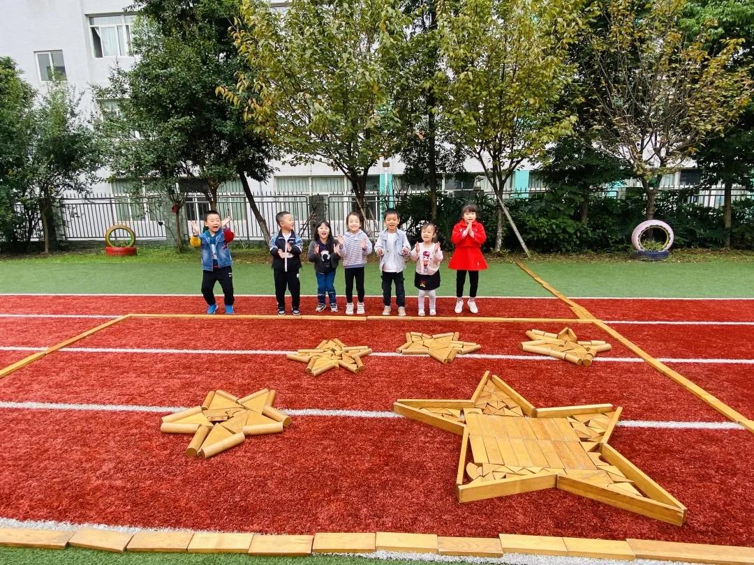在为祖国庆祝生日的活动中,教师带领幼儿一起和国旗合影留念,在为部分孩子拍照的时候,其他孩子在玩户外建构区的积木。轮到念恩拍照时,念恩问教师:“黄老师,我们和国旗合影,那我们在建构区可以拼搭国旗上的五角星吗?”于是,关于“五角星”的游戏想法开始在他们的脑海中酝酿.....