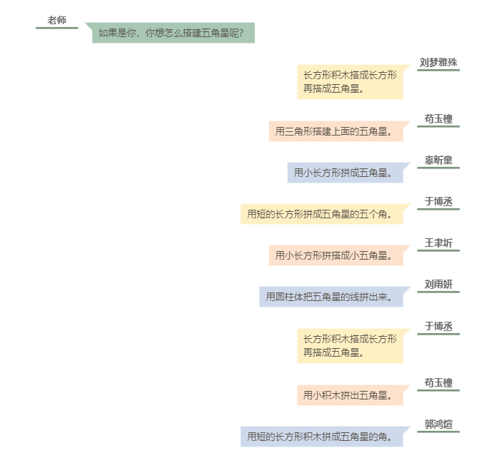 借着国庆活动,小朋友们无时无刻都在和国旗“打交道”,当教师听到孩子们想用积木拼搭五角星时,起初以为只是一次偶发行为,没想到孩子们能围绕这一主题持续地进行下去,结合自己对积木、对五角星的了解,不断地升级游戏玩法,并引发了一系列的讨论与思考,这是作为教师感到最惊喜的地方。