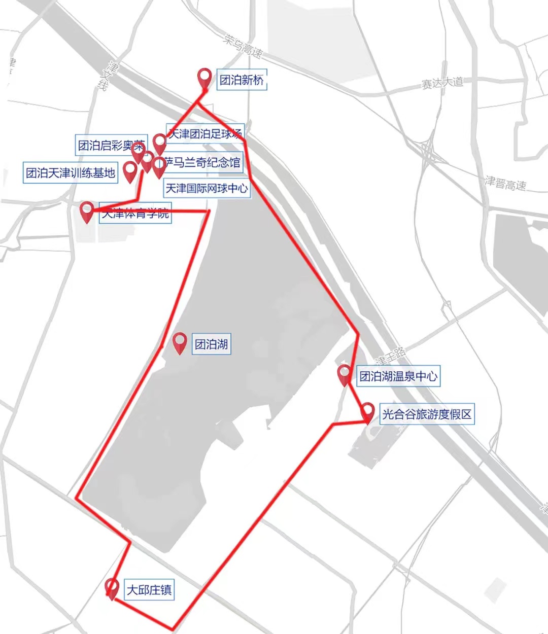 据悉,“环团泊湖体育休闲旅游线路”位于合作示范区内,该线路全长约65公里,环绕团泊湖,途径彩针大桥、团泊启彩奥莱、天津团泊足球场、萨马兰奇纪念馆、团泊天津训练基地、天津国际网球中心、团泊湖温泉中心、光合谷旅游度假区等11个点位,自然与人文风光兼备。