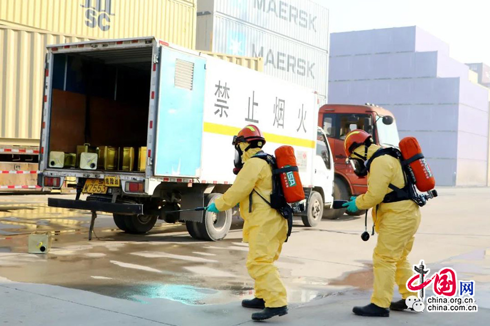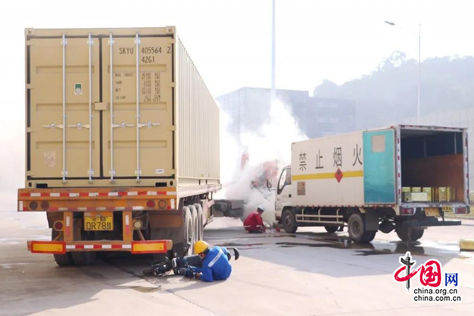 本次演练模拟凤岗镇某公司1辆大货柜车行驶至深圳龙岗和凤岗交界处道路时,与1辆运输危险化学品小货车发生碰撞,导致运输的天那水泄漏。跟随在小货车后方行驶的电动自行车撞到货车侧面。事故共造成2人重伤、2人轻伤,交通中断。发现事态严重,货柜车司机立即开启事故警示灯、摆放事故警示牌,查看伤情后向120请求急救、向110报警。