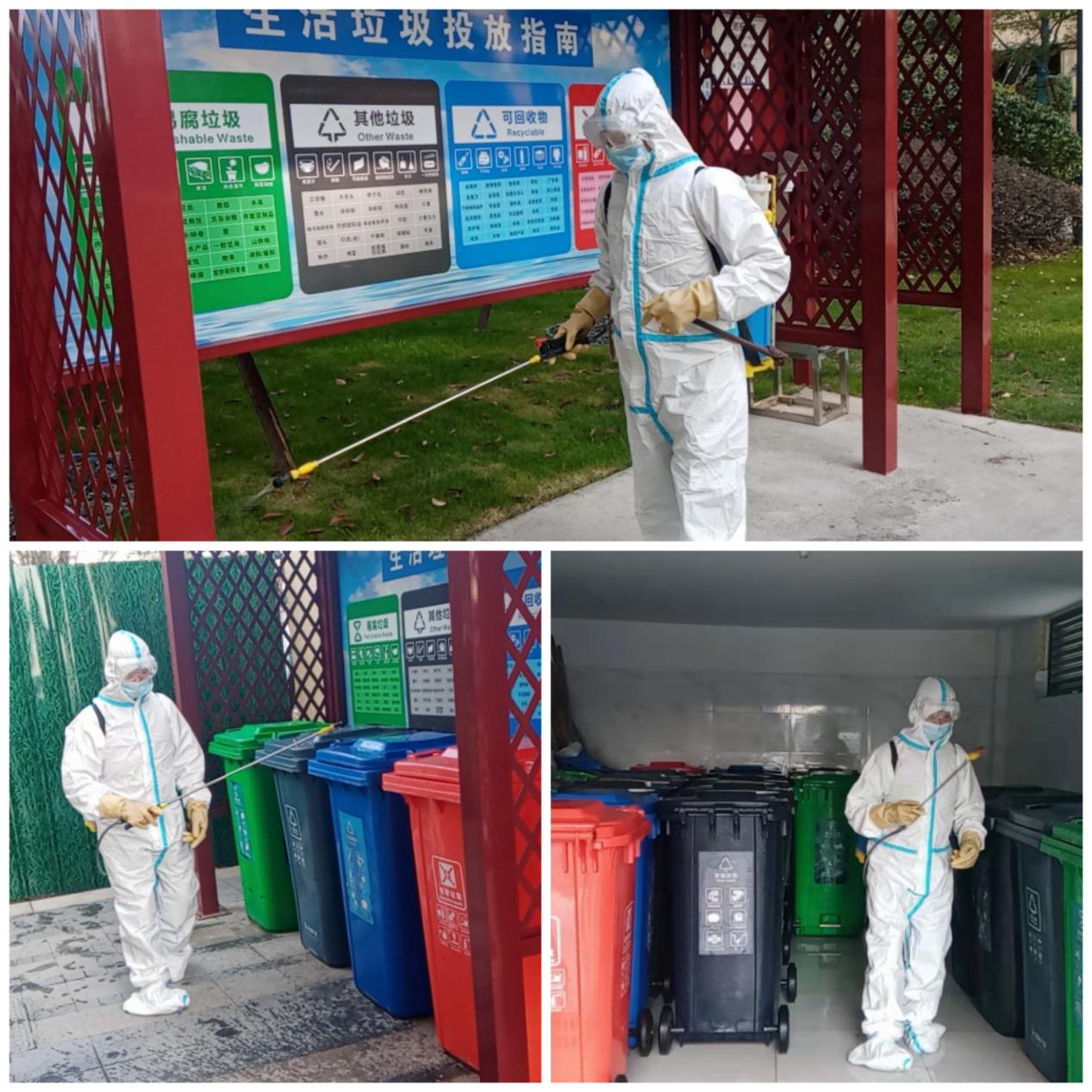 图3新湾街道社区工作人员对小区垃圾分类投放点及垃圾房进行消杀