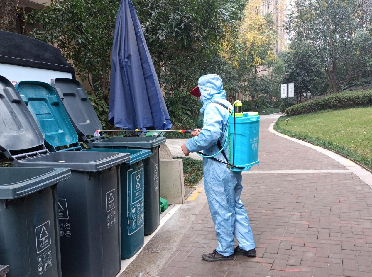 图4下沙街道早城社区工作人员对小区垃圾投放点进行消杀