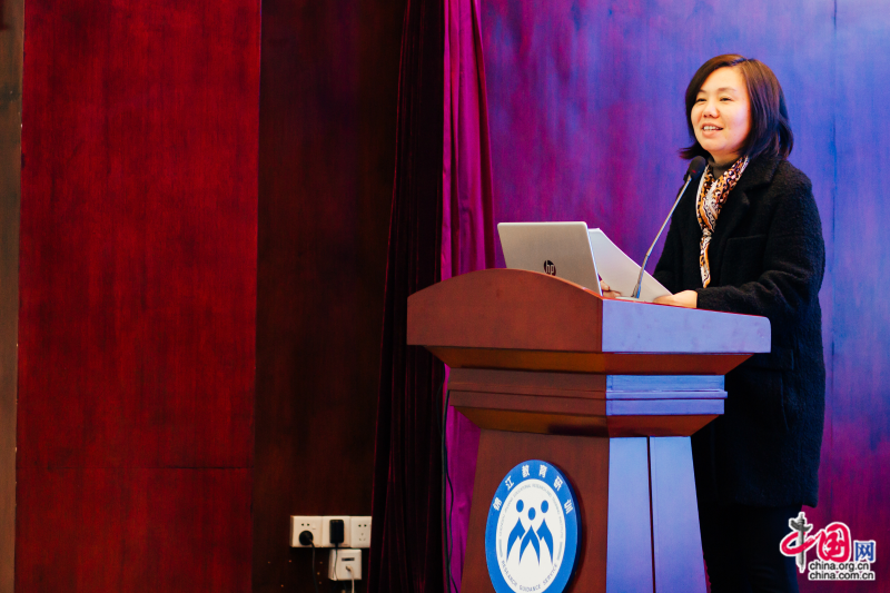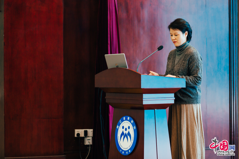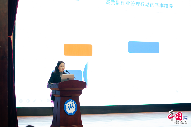 成都市棕北中学副校长邹燕以《为了每一位学生的全面发展和健康成长》为主题,从教改带动、教研推动、家校联动三个方面阐释了学校在作业设计上的改革,分享了日常教研规范作业设计、专题教研优化作业设计、大教研融合作业设计具体教学实践。