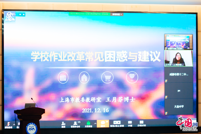 成都市教育科学研究院谭文丽副院长说,成都市一直对教育科研的转化高度重视,不断在创新优秀成果上探索和突破。她介绍了成都市作业设计成果推广项目的指导专家团队:上海市教委教研室王月芬副主任、中国教育学会基础教育国家级优秀成果推广应用项目组负责人方华主任、西南大学罗生全教授、华东师范大学胡惠闵教授、四川师范大学李松林教授、毛秀珍教授、王素月副教授以及成都市教育科学研究院院长助理黄祥勇等。谭文丽副院长还表示成都市将依靠强有力的专家团队支持和指导,让优秀成果的推广落得更深、更实!