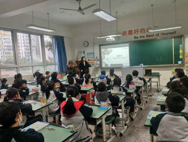 教研员欧圆圆老师走进一年级张露老师快乐有趣的《搭积木》课堂,指导老师从数学情境中抽象出算理,研讨加与减的关系。