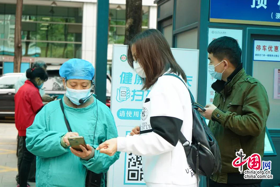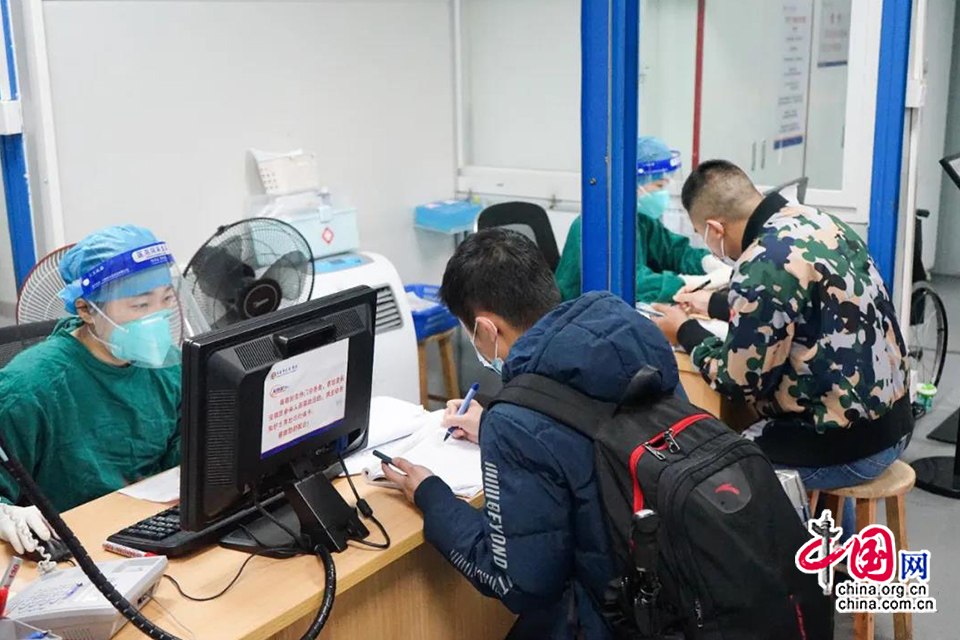 在长安医院发热门诊处,医护人员正在对有新冠肺炎十大可疑症状的患者进行行程信息登记、症状问询等工作。疫情以来,长安医院专门设置发热门诊,对患者进行分类安排诊治。