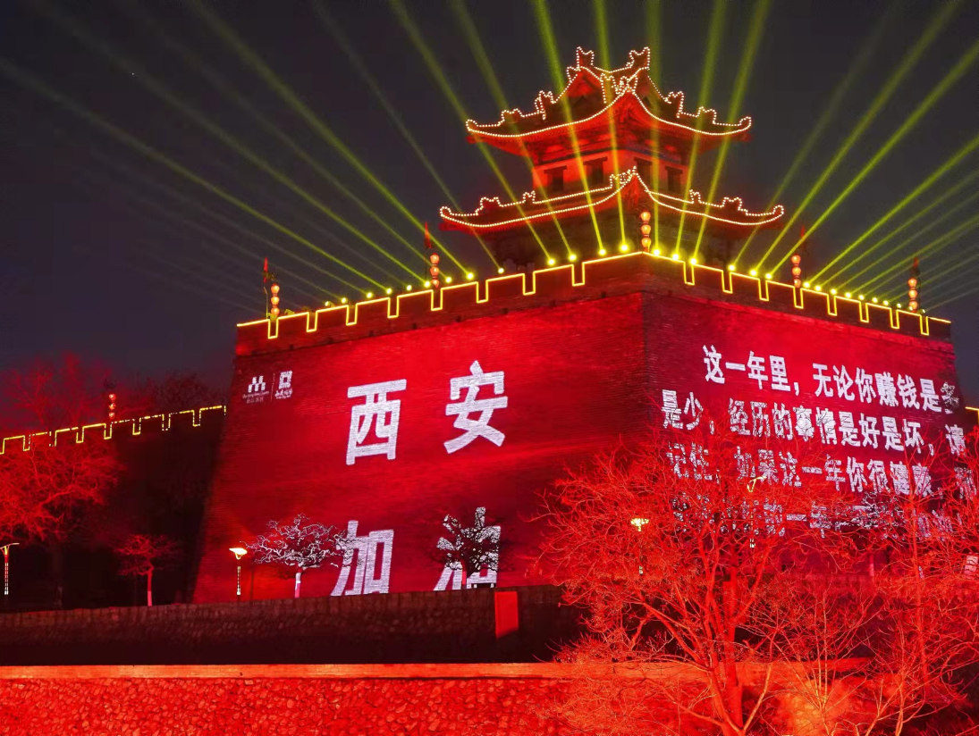 “西”望你我,“安”然无恙。12月22日晚,西安城墙景区举行“西安加油”光影展示,用璀璨的灯光和真挚的词语鼓舞战“疫”士气,表达古城人民抗“疫”必胜的决心。