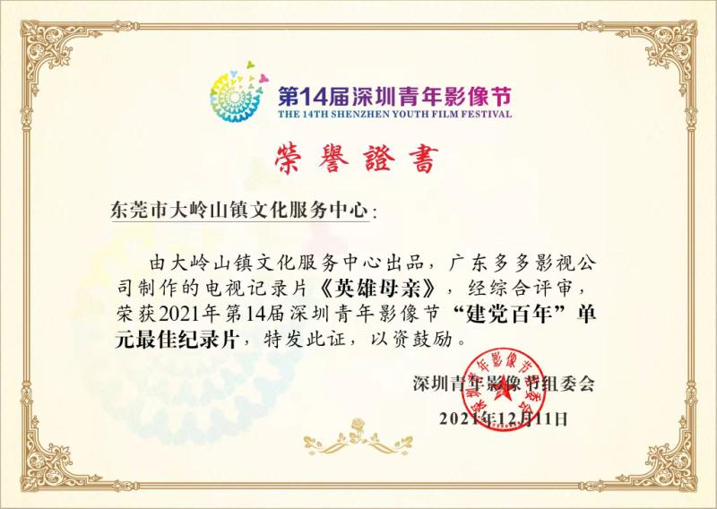 荣获第14届深圳青年影像节“建党百年”最佳纪录片奖的《英雄母亲》,由中共东莞市委宣传部、东莞市大岭山镇人民政府出品,东莞市大岭山镇文化服务中心组织策划,广东多多影视传媒有限公司承制,是2021年东莞市文化精品专项资金扶持项目。该片在中央广播电视总台CCTV-7国防军事频道《军事纪实》栏目首播后,又分别在CCTV-老故事频道、CCTV-发现之旅频道播出,受到广大观众的追捧,并引起国内数十家主流媒体的报道。