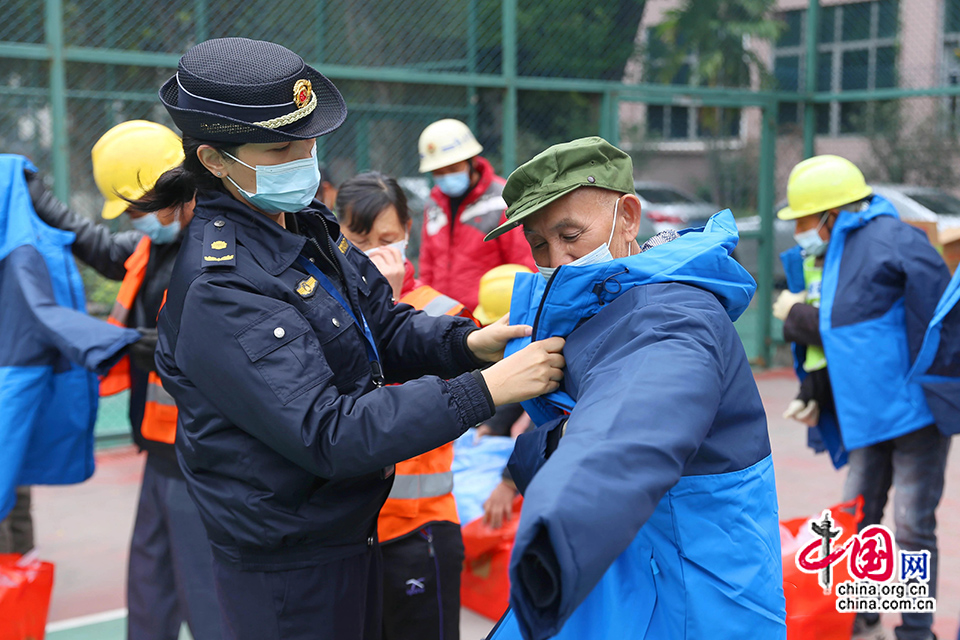 收到暖心福袋的环卫工人,笑呵呵地穿上保暖衣,戴上手套、围巾和棉帽,试试大小,摸摸厚薄,再互相看看穿着效果,一个个笑容满面,不停说着“倍儿暖”。