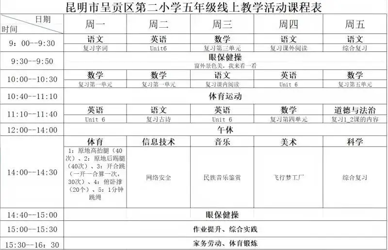 通过微信公众平台先后推送《昆明市呈贡区第二小学暂缓入学学生服务指南》《昆明市呈贡区第二小学线上教学温馨提示》,从安全健康、疫情防控、居家要点几方面给家长做宣传引导,开通学校心理咨询电话等方式正面引导缓解学生暂缓入学期间家长孩子焦虑情绪。学校每天8:20准时开启网上课堂,利用钉钉课堂开展线上教学活动,教学覆盖两个校区51个班共2374名学生。课程安排以语文、数学等常规课程,按各班课表进行上课,科学、英语、道法专科课程按年级上课,在常规课程中穿插眼保健操、体育运动、家务劳动等特色课程。