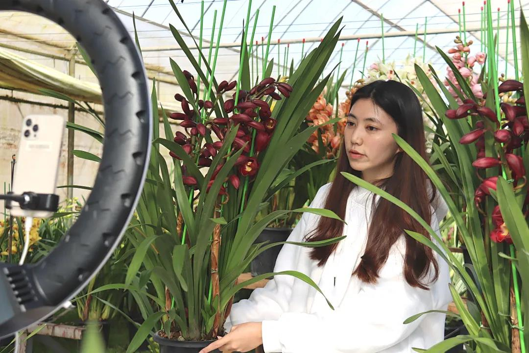 在博源农业科技有限公司,花卉基地里也是一片繁忙,成片的大花蕙兰在工人们的协作下包装装箱,直播现场也是互动不断。负责人李永明告诉记者,大花蕙兰的种植还有很大空间,他们家除了大花蕙兰种苗种植、销售外,目前正在做新型花卉兰种植技术专利申报,一般来说大花蕙兰的生长周期是3年,新型高效大花蕙兰创新实现约2年的生长周期,花卉生长周期缩短后成本减少约40%,能大大提高企业利润空间。
