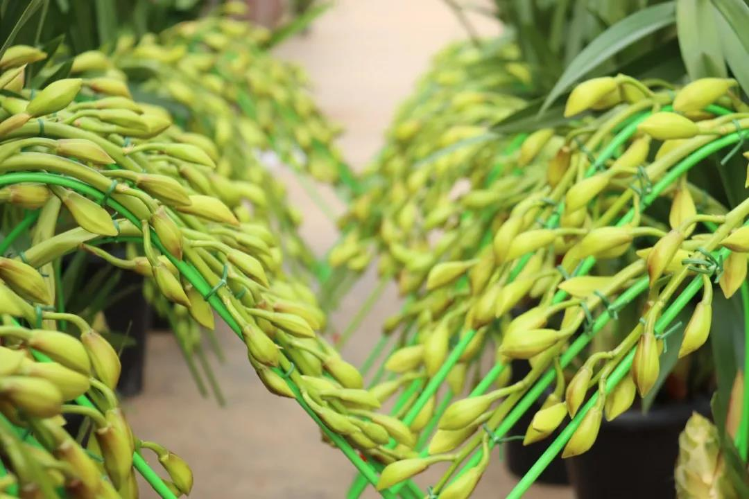 该基地10月份就开始进行换苗、选芽、两次选盆、固定花杆等程序,为花卉预售做准备。除了各地经销商来看花选花外,基地也直接对越南、泰国等东南亚国家的客户直接发货,有些较高品质的大花蕙兰甚至看不到花开就直接运往东南亚。