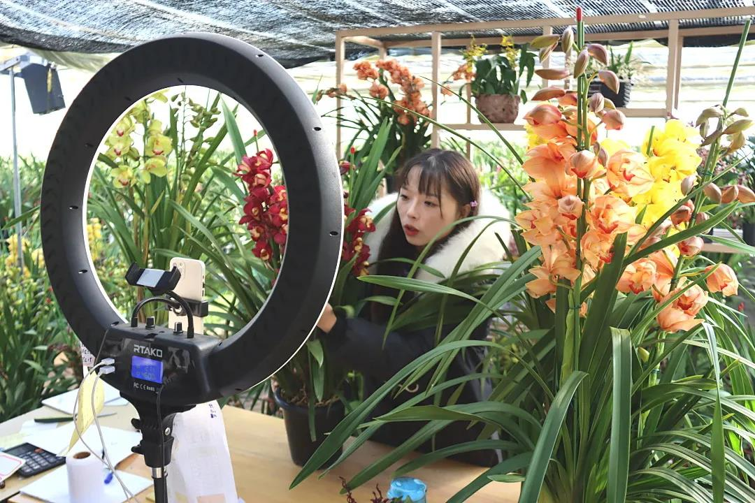 “往年的订单也比较多,品种都是大型大花蕙兰,也有杂交大花蕙兰,今年这种新品大花蕙兰比较畅销,叶子周边多了一层浅绿,开花也特别好看。”黑营盘社区的云润花卉有限公司负责人段玲如是说。“我们也有开自己的直播间,今年的营业额也增加了20%左右。”