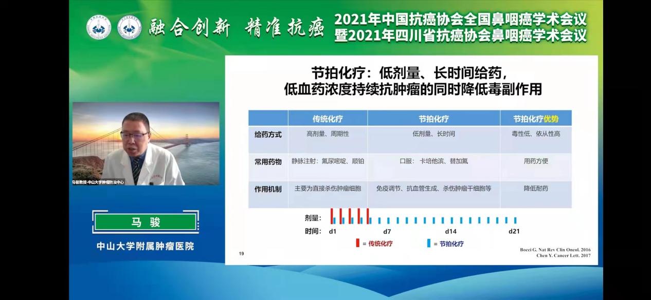 中山大学附属肿瘤医院马骏教授分享的是《2021鼻咽癌综合治疗进展》。马教授解读了1998美国NCCN指南推荐局部晚期鼻咽癌的治疗方式,分享了局部复发鼻咽癌治疗的最新进展,为提高化疗疗效,探索了化疗新方案及降低诱导化疗毒副反应的最佳诱导化疗方案,对于卡培他滨节拍化疗及作为辅助治疗新模式的安全性、有效性的研究进行介绍。川北医学院附属医院谭榜宪教授主持。