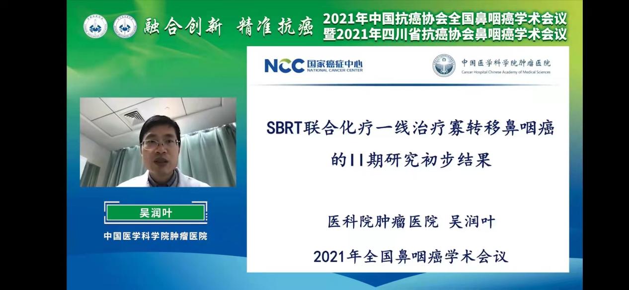 中国医学科学院肿瘤医院吴润叶教授分享的是《SBRT联合化疗一线治疗寡转移鼻咽癌的II期研究初步结果》。吴教授为在早期转移阶段进行积极干预改善长期预后,从研究背景、目的介绍了SBRT联合化疗寡转移鼻咽癌的疗效。电子科技大学医学院附属肿瘤医院四川省肿瘤医院张石川教授、宜宾市第一人民医院袁志平教授主持。中国医学科学院肿瘤医院易俊林教授、华中科技大学附属同济医院胡国清教授、复旦大学附属医院肿瘤医院王孝深教授参加讨论。
