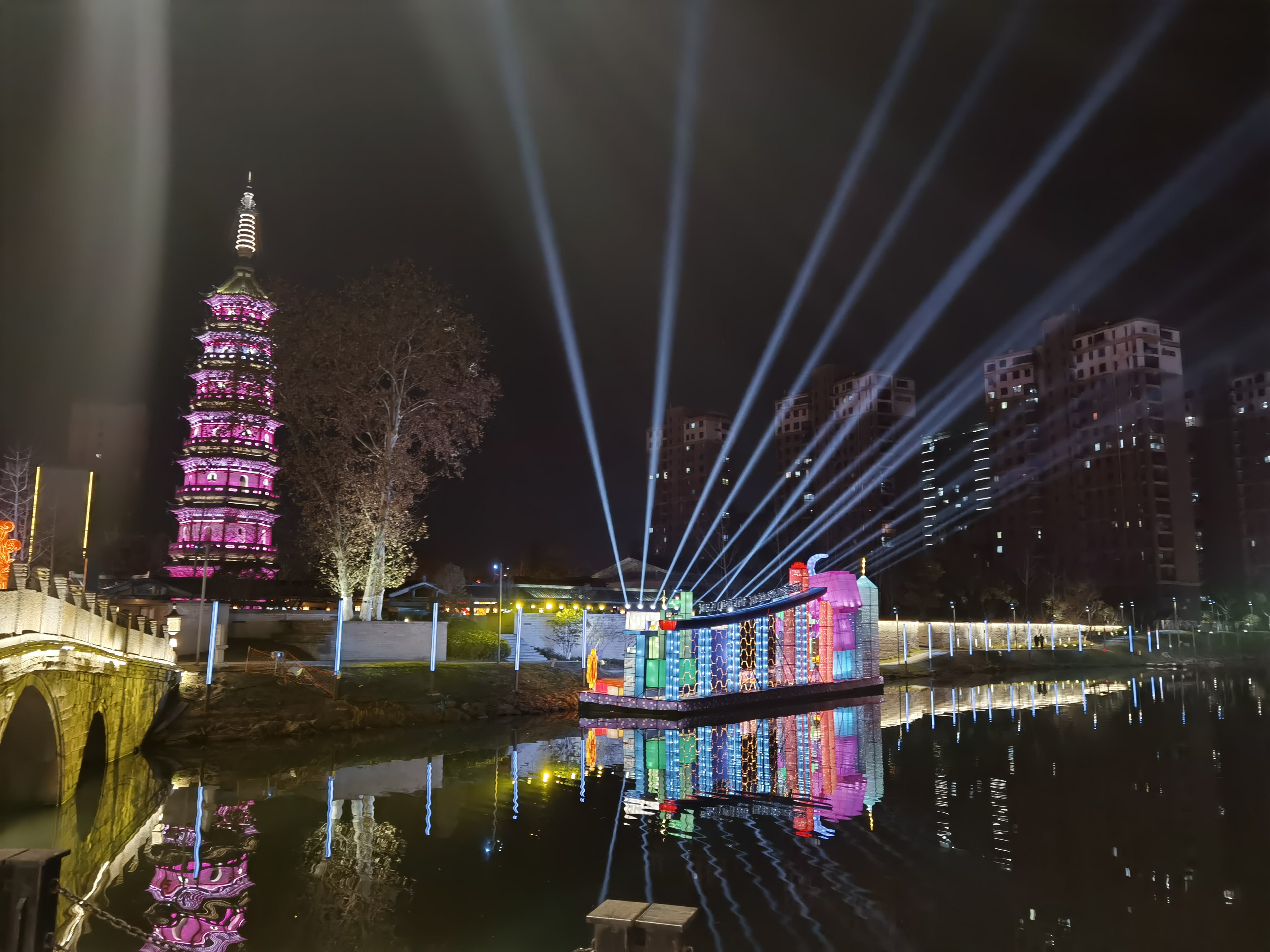 从宝塔公园跨过永昌桥,河对岸的永寿坊街区则充满浓浓的现代时尚感。时光隧道、天使翅膀、空中钻石、几何拼接的月亮、灯雕牌坊等现代灯组炫酷惊艳。据介绍,天使翅膀、时光隧道等灯组都具有互动功能,游客可在现场拍出创意照片。