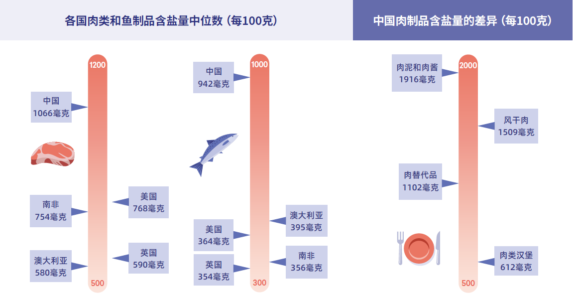 • 研究分析了2012-2018年期间,中国、美国、英国、澳大利亚和南非五个国家超过26000个预包装肉类和鱼制品的钠含量。