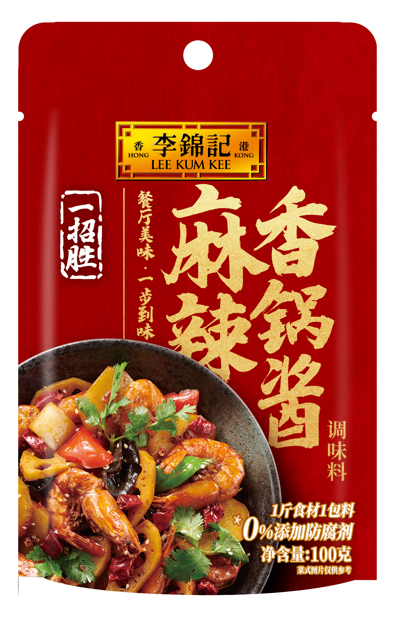 李锦记麻辣香锅酱:0%添加防腐剂,精选腌制辣椒、四川花椒、发酵600天以上,晒足360天的郫县豆瓣研制而成,1招出好菜,入口麻辣鲜香,难以忘怀。