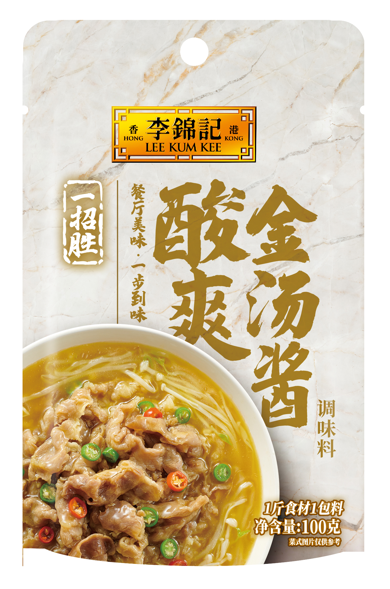 李锦记酸爽金汤酱:精选猪骨汤、鸡骨汤配以精心腌制黄灯笼椒研制而成,1招出好菜,入口酸爽过瘾难以忘怀。