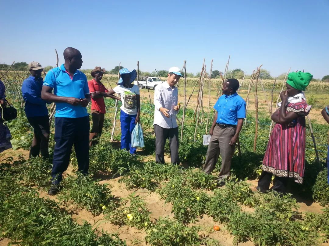 2015年,粮农组织-中国南南合作计划派遣的中国专家在纳米比亚为当地农民讲解西红柿合理密植与搭架技术。©FAO